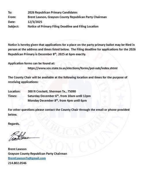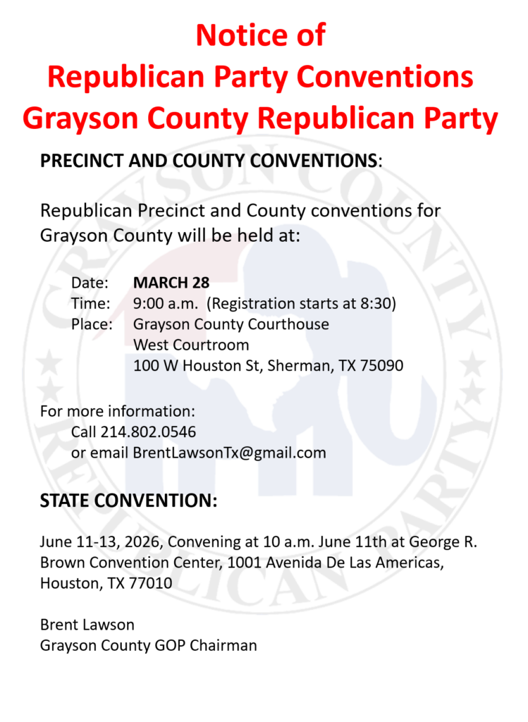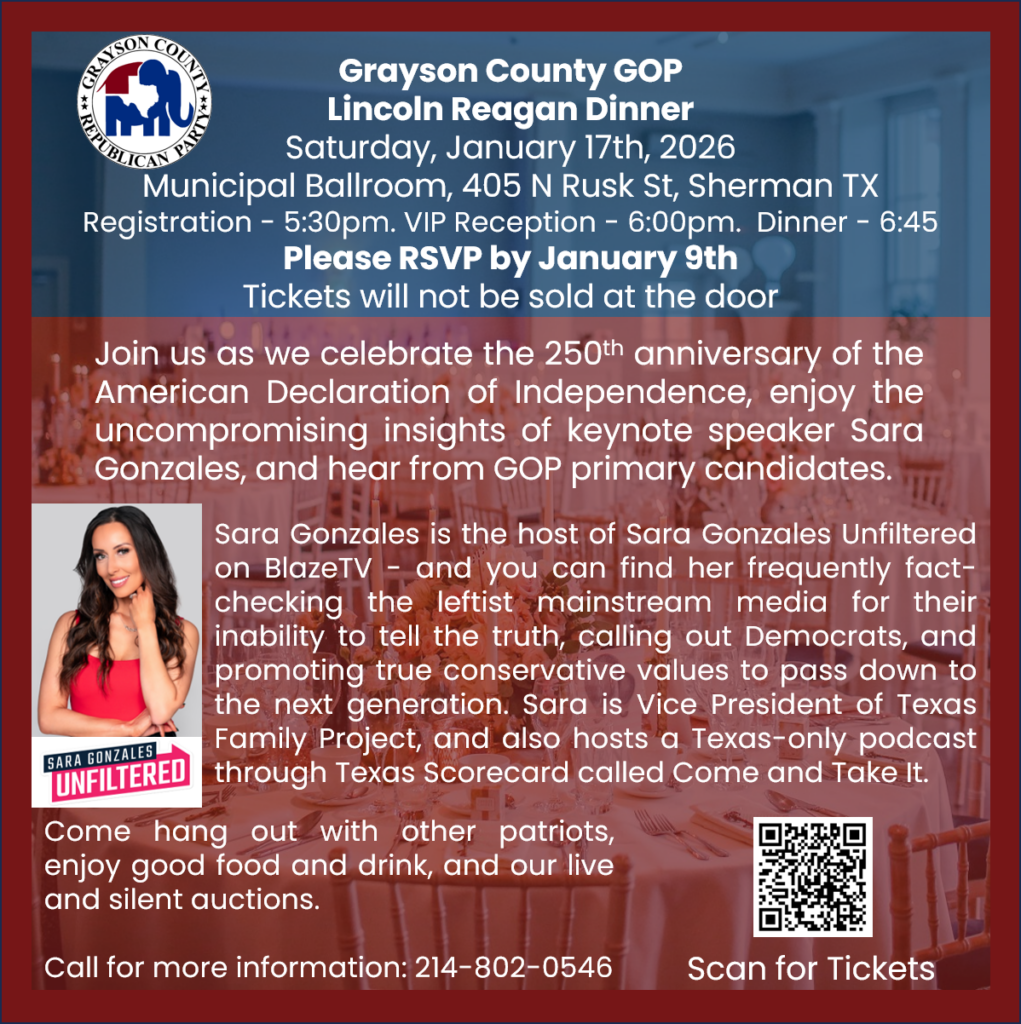 We urge you to get involved, stay informed, and most importantly, make your vote count. Every ballot cast is a step toward preserving the principles we cherish and building a brighter future for Grayson County and beyond.